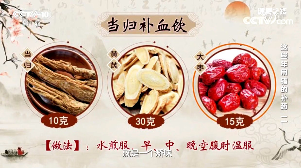 當(dāng)歸補(bǔ)血飲由三味藥組成,當(dāng)歸10克,黃芪30克,大棗15克。當(dāng)歸補(bǔ)血;黃芪補(bǔ)氣;大棗補(bǔ)氣血,矯味,將三者制成代茶飲,適合血虛或氣血兩虛的人長期服用。(資料來源:央視《健康之路》)