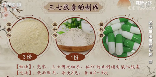 專家建議:在服用三七之前,還是要到醫(yī)院,請(qǐng)專業(yè)的醫(yī)生來進(jìn)行搭配,對(duì)癥下藥。(資料來源:央視《健康之路》)