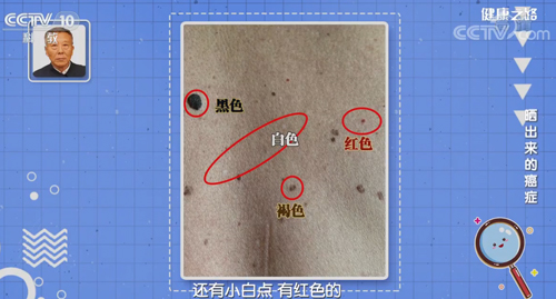上圖是一位老年人胸前部有斑點的照片,專家表示,圖中紅色、黑色、白色、褐色的斑點是皮膚老化的一種表現(xiàn),是老年人常有的現(xiàn)象,不會變成癌,不用擔心。