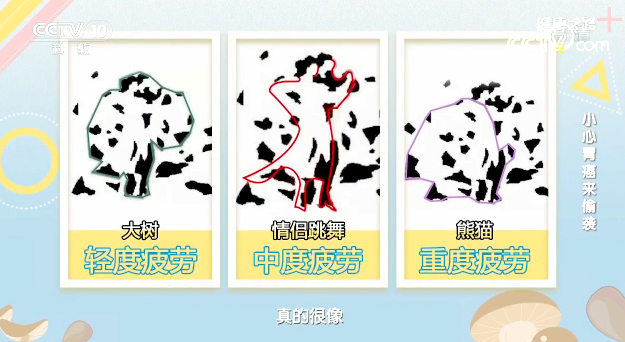 一般來講,看到大樹,提示其疲勞程度較輕;看到兩個人在跳舞,提示其為中度疲勞;看到熊貓,那么提示其疲勞程度較重。
