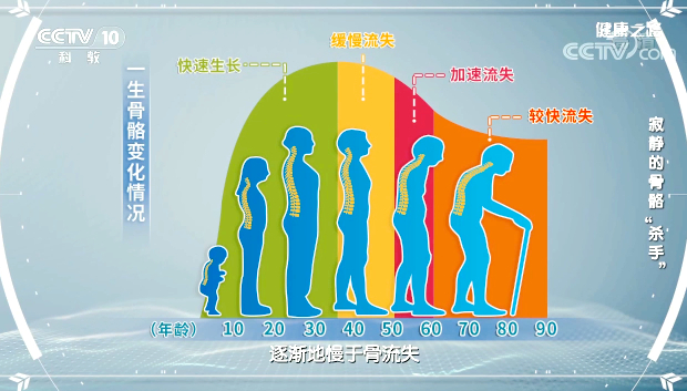 人體骨骼隨著年齡的增長(zhǎng)不斷變化,30歲之前,成骨活性大于骨流失量,骨骼逐漸變得強(qiáng)壯;30-40歲之后,成骨的活性、功能逐漸慢于骨流失;60-70歲之后,老年人骨量流失越來(lái)越快,容易發(fā)生骨質(zhì)疏松。