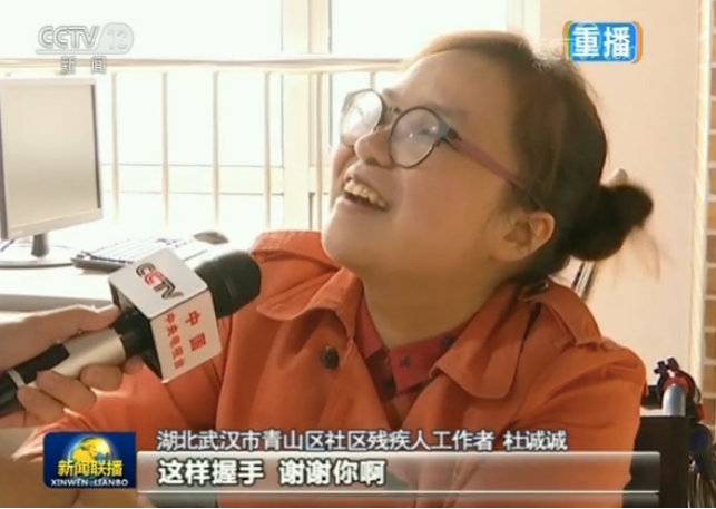 當總書記快走到杜誠誠面前時,他看到小姑娘身坐輪椅、腿腳不便,便快步走上前,主動躬下身伸出右手,隨后加上左手,與杜誠誠的雙手緊緊相握。總書記慈祥地看著她、看著她的輪椅、看著她的桌子、看著她的工作照,仔細聽她介紹如何開展為盲人講解電影服務的工作情況,并夸獎這是一項很有意義的工作。