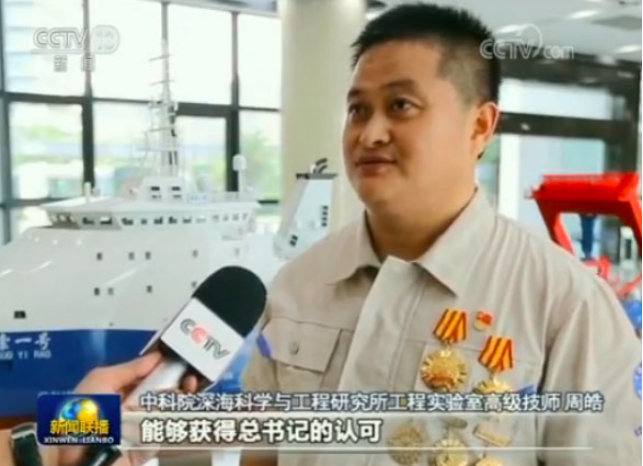 今年4月初,海南,習近平總書記來到設在三亞市的中國科學院深海科學與工程研究所,詳細了解我國自主研發的深海科考裝備。當走到工作人員身邊,無意間看到周皓胸前佩戴的獎章時,習近平總書記主動上前跟他交談。