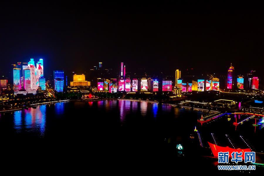這是青島浮山灣展現(xiàn)青島風(fēng)光的主題燈光秀(5月7日無人機拍攝)。新華社記者 李紫恒 攝