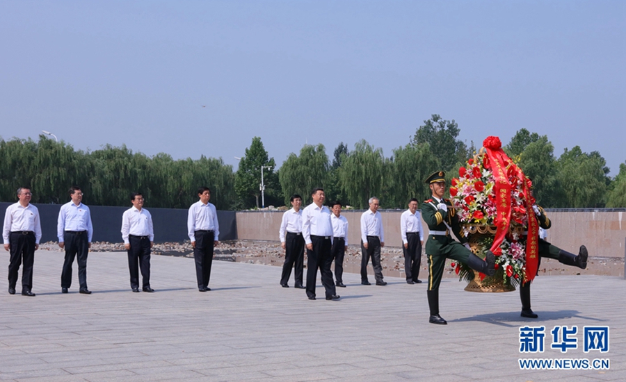 2016年7月28日,中共中央總書記、國家主席、中央軍委主席習近平到河北唐山市調研考察。這是習近平在唐山地震遺址公園向唐山大地震罹難同胞和在抗震救災中捐軀的英雄敬獻花籃。 新華社記者 蘭紅光 攝