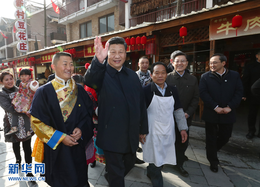2018年2月12日上午,習近平在阿壩藏族羌族自治州汶川縣映秀鎮看望慰問群眾。 新華社記者 鞠鵬 攝