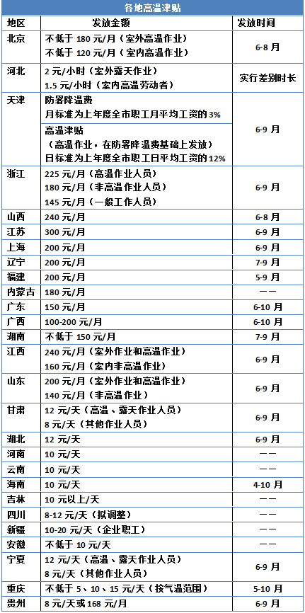 從高溫津貼發放時間來看,各地也因氣候條件差異有所區別。如,北京、山西等北方地區的發放時間段為6到8月,海南省的發放時間長達7個月,為4到10月。