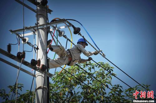 資料圖:福州一電力作業人員冒高溫爬上電桿作業。王東明 攝