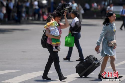 5月15日,湖南長沙持續高溫,市民頭頂烈日出行。 中新社記者 楊華峰 攝
