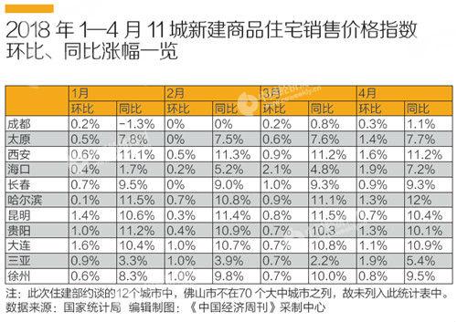 根據(jù)國家統(tǒng)計局公布的數(shù)據(jù),《中國經(jīng)濟周刊》記者梳理了除佛山外的11城2018年1至4月新建商品住宅與二手住宅銷售價格指數(shù)情況,發(fā)現(xiàn)無論是新建商品住宅,還是二手住宅;無論是環(huán)比,還是同比漲幅,被約談的城市中都有“領(lǐng)漲”的表現(xiàn)。以4月的情況為例,被約談的海口、三亞、西安、太原、哈爾濱、貴陽等城市均位列4月房價環(huán)比漲幅前十位;哈爾濱新建商品住宅12%,以及西安二手住宅9.4%的同比漲幅更是位居70城之首。
