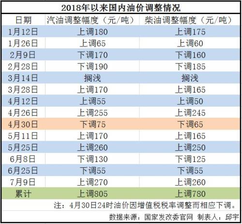 據(jù)國家發(fā)改委通知,自7月9日24時起,國內(nèi)汽油價格每噸上調(diào)270元,柴油價格每噸上調(diào)260元。