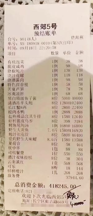 據(jù)賬單顯示,這是上海一家名為“西郊5號(hào)”的飯店,結(jié)賬時(shí)間是9月18日22:20,用餐人數(shù)為8人,總共消費(fèi)金額逾41萬(wàn)。賬單右下角,手寫(xiě):實(shí)收40萬(wàn)元。