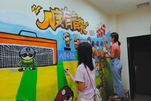 阮珍妮和妹妹在自家樓下畫壁畫。 來源:受訪者供圖