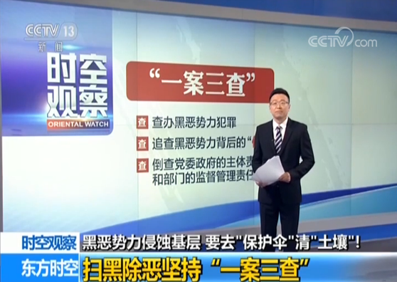 中央開展掃黑除惡專項斗爭還提出堅持“一案三查”:既要查辦黑惡勢力犯罪,又要追查黑惡勢力背后的保護傘,還要倒查黨委政府的主體責任和部門的監督管理責任。