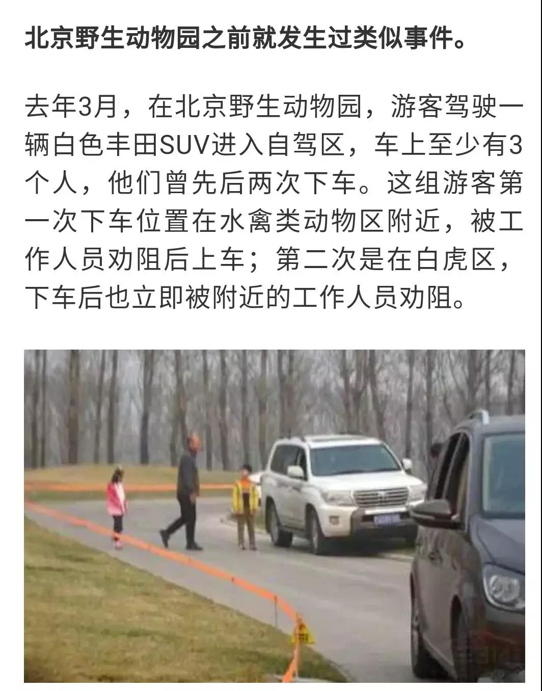 北京野生動物園市場部相關工作人員稱,自駕游覽區是嚴禁游客下車的,他們已將此事上報,園方相關部門正在調查。