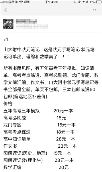 “高考之前,來找我爸爸預(yù)約我的筆記的主要是一些學(xué)弟學(xué)妹的家長,還有就是一些高考筆記的‘專業(yè)賣家’。這些人包括一些在學(xué)校附近的文具店老板,他們對學(xué)校的考生情況非常熟悉,也知道高考筆記有市場。他們會等周末放學(xué)的時候等在校門外,和家長攀談,爭取說服家長,等高考之后把我們的筆記賣給他們。我沒同意過他們,只不過加了一些賣家的微信。”王方回憶說。