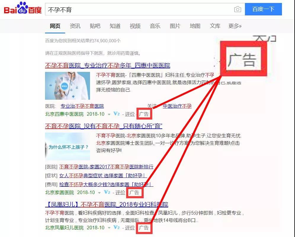 比如我們搜索“不孕不育”,跳出來的兩條信息都帶有“廣告”。如果是正規的知名公立醫院,網站通常會標注“官網”兩個字,代表其官方權威性。