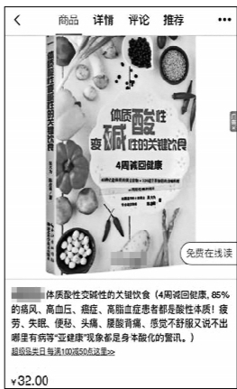 在該平臺上,還有最近幾年出版的《體質酸性變堿性的關鍵飲食》,圖書介紹中描述道:“4周堿回健康, 85%的痛風、高血壓、癌癥、高脂血癥患者都是酸性體質”,北青報記者注意到,該書已有3300多條評論。另一本《把健康“堿”回來》也在圖書介紹中寫著“酸堿不平衡,體內百病生”。