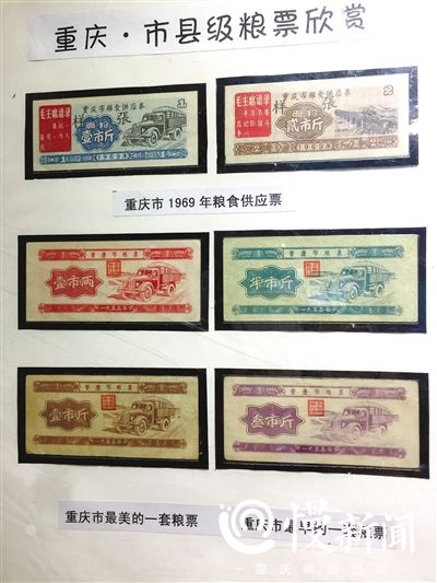 展出的藏品中,以糧票最多。從1955年最早的糧票到1988年最后的糧票,根據不同時期、不同地區,整齊排列在墻上,有彭水、忠縣、榮昌、云陽等各個區縣的,蔬菜糧油專用票、糯米供應券、糖果糕點供應券,貳兩、壹市斤、伍市斤、一公斤、五公斤,面額各有不同。