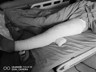 躺在病床上的李志鋒,一條腿上纏著厚厚的紗布。
