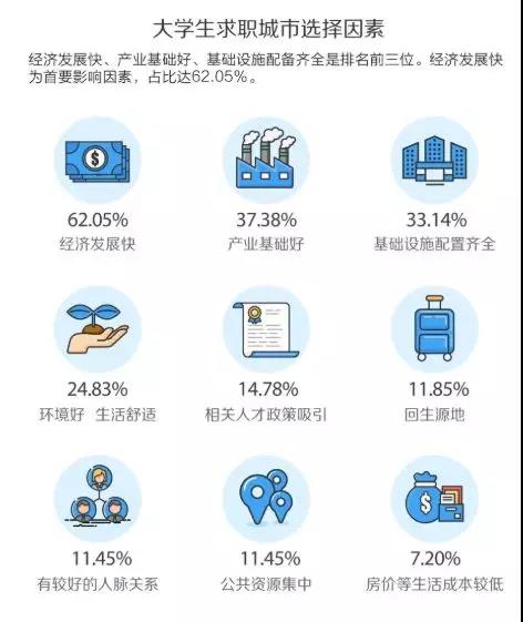 新一線城市要想吸引大學生前來就業,經濟發展是最為重要的影響因素,占比62.05%,經濟發展快在大學生看來意味著機會多、平臺大、視野廣等積極信號,他們更希望到有更多挑戰與可能性的城市開始自己的第一份工作。