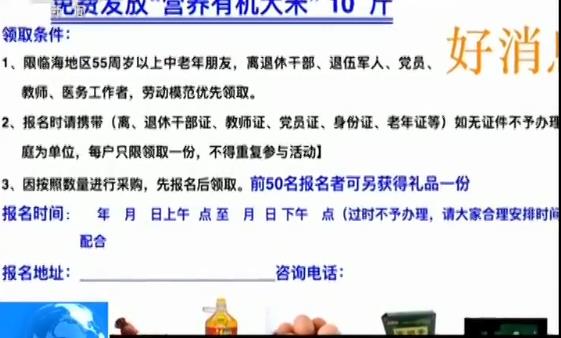 在收繳的電子證據中,記者看到了一份“抗擊血栓 讓愛無限 免費發放有機大米”的宣傳單。記者注意到,這份宣傳單上寫著發放對象限55歲以上中老年消費者。
