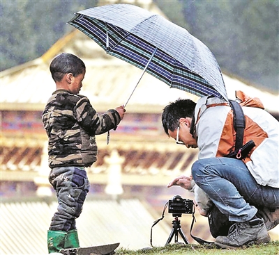 還有一張照片,被我珍藏了很久。那是我在藏區(qū),當(dāng)時我外出拍攝,遇到了下雨。以我的性格我是不會選擇停工的,雖然沒法進行航拍,但是延時攝影還是要堅持做的。我把我的傘讓給了相機,自己淋雨操作。一個藏族的小孩子看到我當(dāng)時的樣子,主動幫助我打傘,而他自己的身體倒是有一大半在外面淋著。我的同行伙伴,幫我記錄了這個瞬間。