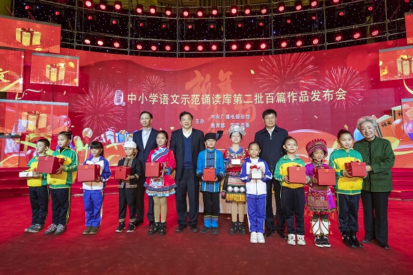 2018年12月23日下午,中央廣播電視總臺(tái)、教育部、國(guó)家語(yǔ)委聯(lián)合舉辦“中小學(xué)語(yǔ)文示范誦讀庫(kù)”第二季作品發(fā)布會(huì)。中宣部副部長(zhǎng)、中央廣播電視總臺(tái)臺(tái)長(zhǎng)慎海雄,教育部副部長(zhǎng)、國(guó)家語(yǔ)委主任杜占元,中央廣播電視總臺(tái)副臺(tái)長(zhǎng)閻曉明出席發(fā)布會(huì),并共同見證第二批100篇音頻教材正式上線發(fā)布。 新華社記者沈伯韓 攝