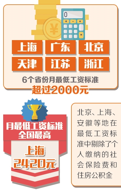 與企業工資指導線不同,最低工資標準被視為一項硬性指標,是在勞動者正常勞動情況下,用人單位必須依法支付給勞動者的報酬。所謂正常勞動,是指勞動者在法定工作時間或者勞動合同約定的工作時間內從事的勞動。勞動者在國家和省規定的年休假、產假、計劃生育手術假、探親假、婚喪假等假期內休假,以及在工作時間內依法參加社會活動,視為提供正常勞動。截至2018年12月份,上海、廣東、北京、天津、江蘇、浙江這6個省份月最低工資標準超過2000元。上海月最低工資標準達到2420元,為全國最高。