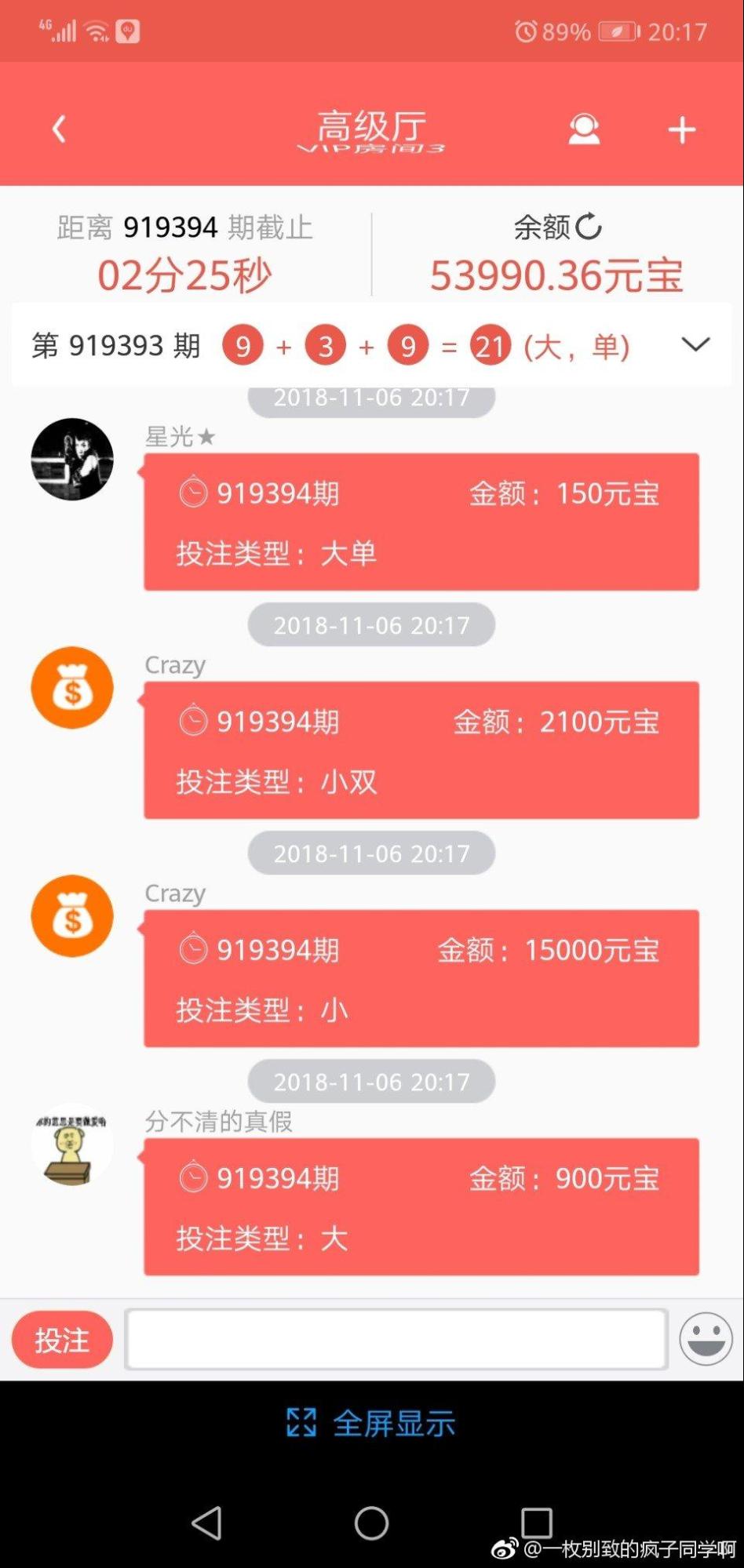 “就這樣在他的蠱惑下,我3號當天充了500元,當天他是充了‘5萬’,并帶著我買,他每次告訴我買什么大小雙單幾倍后,便會以我的一百倍進行下注,買完后會讓我發個表情回應他已經買過了。他帶著我買,一方面是博取我的信任,另一方面他會在另一邊計算我的余額,這樣方便他們背后操作數據,讓你什么時候中,什么時候不中。在買的過程中他會一直跟我透露他在高級廳,高級廳賠率有4.4,投注100,中獎是440,而我當時是在初級廳,賠率是3.9,并一直跟我透露有5萬本金就好了,賠率高,而且彩金就能先賺3000多元,一晚上在他的規劃下怎么著都能賺個1萬多。”
