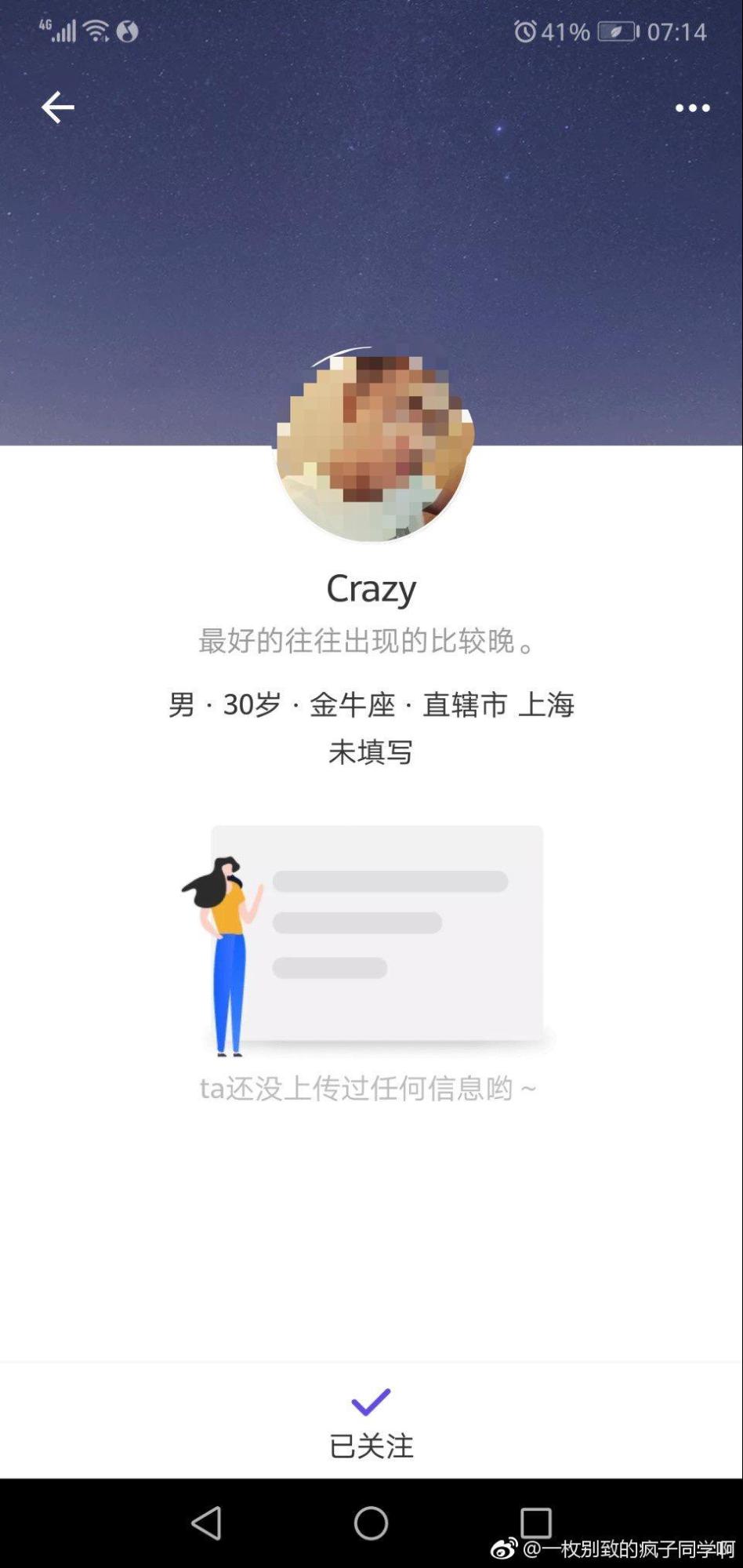 很快,一個昵稱為crazy的帥氣男孩就跟小燕打了個招呼,說自己是系統匹配的CP(對象)。互加微信之后,男孩介紹說自己30歲,上海人,西安交通大學畢業的,現在在創業,主要做體育工程,名叫劉佳輝。