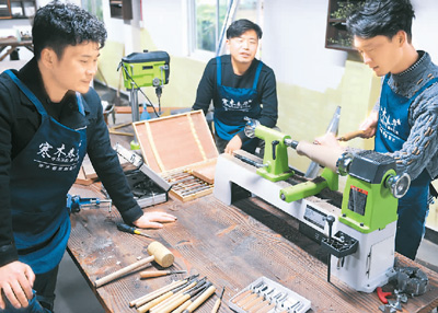 回鄉創業正成為大學生就業的重要方向。上圖為浙江省湖州市安吉縣統里村,3名大學畢業生在工作坊內加工花器。張禮慶攝(新華社發)
