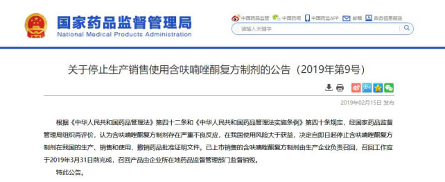 央視網(wǎng)消息(記者 張恪忞):2019年2月15日,國(guó)家藥品監(jiān)督管理局發(fā)布停止使用呋喃唑酮復(fù)方制劑的公告,認(rèn)為含呋喃唑酮復(fù)方制劑存在嚴(yán)重不良反應(yīng),在我國(guó)使用風(fēng)險(xiǎn)大于獲益,決定即日起(2月15日)停產(chǎn)、停售、停用含呋喃唑酮復(fù)方制劑,并于3月31日前完成藥品召回。