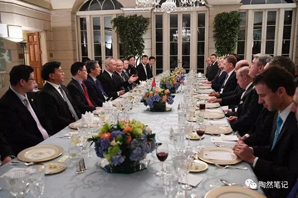 談判結(jié)束后美國(guó)白宮發(fā)布的5張關(guān)于中美經(jīng)貿(mào)磋商的照片里,有三張就是關(guān)于歡迎宴會(huì)的。