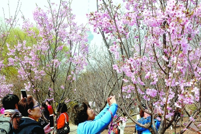玉淵潭公園的杭州早櫻綻放枝頭,游客紛紛拍照留念。北京日報記者 吳鏑攝