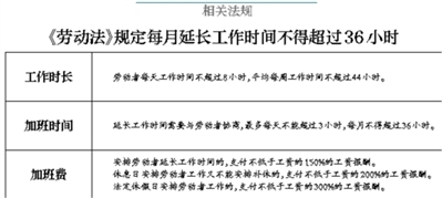京衡律師上海事務所余超律師對北青報記者表示,根據法律,勞動者每天工作時間不超過8小時,平均每周工作時間不超過44小時;延長工作時間需要與勞動者協商,最多每天不能超過3小時,每月不得超過36小時。并且加班必須要支付加班費,平日加班為工資的150%,休息日加班為工資的200%。若公司隨意延長勞動者工作時間,安排周末加班,以及不支付勞動者加班報酬,那么就違反了《勞動法》的相關規定。