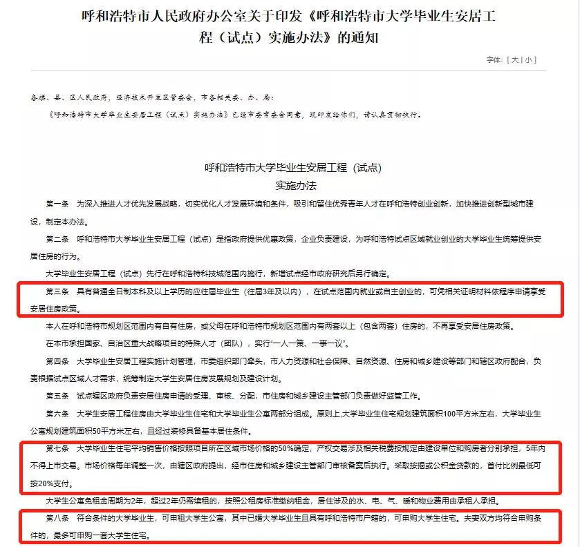 4月18日,呼和浩特市人民政府辦公室印發《呼和浩特市大學畢業生安居工程(試點)實施辦法》(簡稱《辦法》)提出,具有普通全日制本科及以上學歷的應往屆畢業生(往屆3年及以內),滿足一定條件,可半價買房。