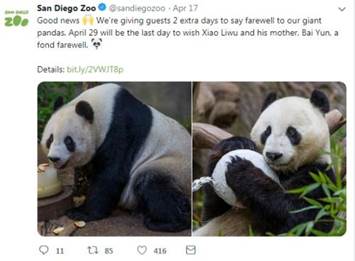 根據圣地亞哥動物園社交媒體官方賬戶的信息,當地時間4月29日,是“白云”和“小禮物”最后一天在動物園與民眾告別的日子。之后,它們將開始準備回國的事宜,不再公開展覽。知道“白云”和“小禮物”將離開的消息后,美國當地民眾“心都碎了”,紛紛表達了難過與不舍之情。