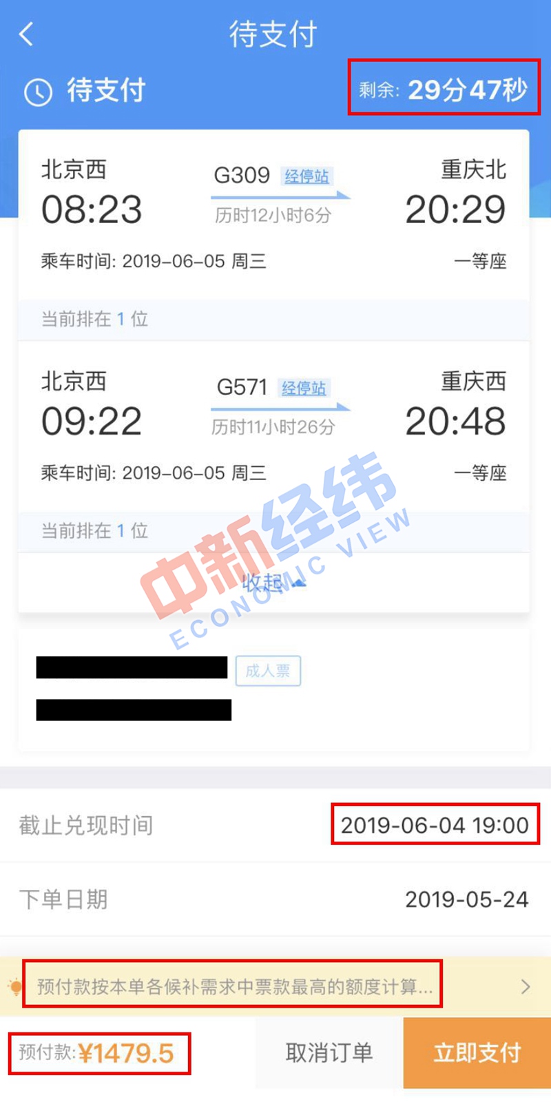5、支付候補(bǔ)訂單。值得注意的是,候補(bǔ)訂單的支付需要在30分鐘內(nèi)完成,預(yù)付款按本單各候補(bǔ)需求中票款最高的額度計(jì)算。如果候補(bǔ)成功(即在兌現(xiàn)時間前搶到車票),預(yù)付票款中多出的部分,將自動退回差額給原賬戶;如果候補(bǔ)購票失敗(即在兌現(xiàn)時間前未搶到車票),預(yù)付款將全額退回。