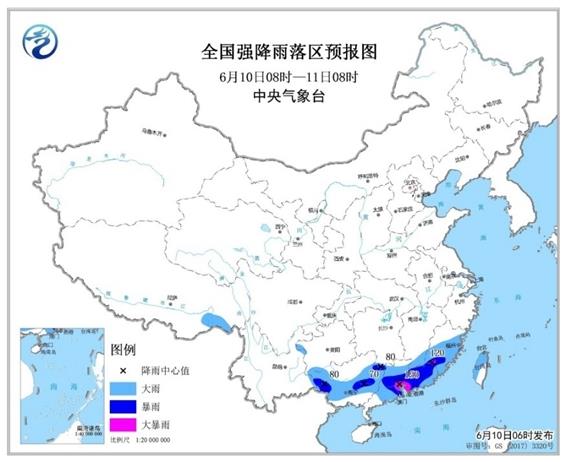 預(yù)計(jì),6月10日08時(shí)至11日08時(shí),福建中南部、湖南東南部、廣西中部、廣東大部等地有大到暴雨,其中,福建南部、廣東中部等地的部分地區(qū)有大暴雨(100~150毫米),局地伴有雷暴大風(fēng)等強(qiáng)對(duì)流天氣,最大小時(shí)降水量30~50毫米,局地可達(dá)60毫米以上。