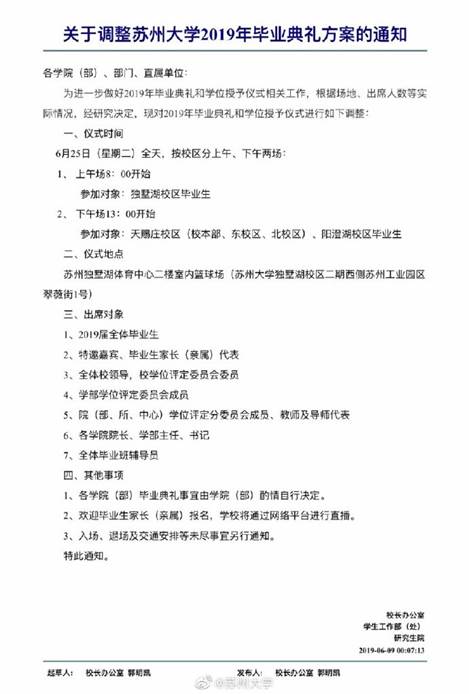 9日,針對此前備受質疑的“畢業典禮僅讓畢業生代表參加”一事,蘇州大學通過其官方微博發布了《關于調整蘇州大學2019年畢業典禮方案的通知》,表示將會增加畢業典禮和學位授予儀式的場次,令2019屆全體畢業生都能參加。