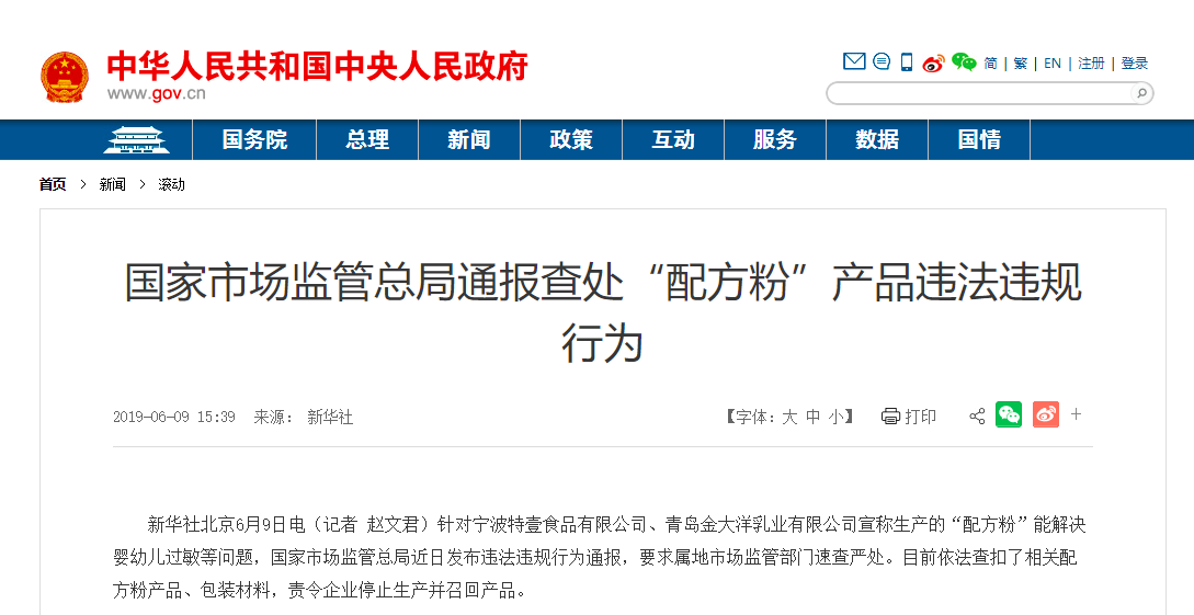 據調查,寧波特壹食品有限公司和青島金大洋乳業有限公司未取得特殊醫學用途配方食品注冊和生產許可。根據食品安全法、廣告法等法律法規,寧波市市場監管局杭州灣分局和青島市黃島區市場監管局分別對上述兩家企業做出查處,出具責令改正通知書,責令企業立即停止發布涉嫌虛假宣傳的信息,停產整改并立即召回相關產品,并依法立案調查。市場監管部門對查封扣押的配方粉產品進行了抽樣檢驗。經檢驗,除產品標簽外,其他項目符合產品標簽明示標準要求。