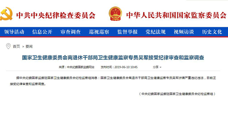 衛(wèi)健委離退休干部局衛(wèi)生健康監(jiān)察專員吳軍接受紀(jì)律審查和監(jiān)察調(diào)查