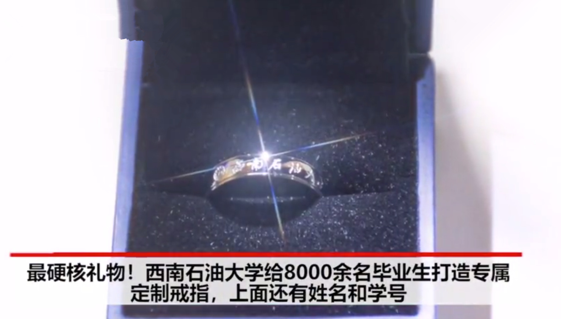 又是一年畢業(yè)季,四川西南石油大學(xué)為8400名畢業(yè)生每人定制了一枚專屬鈦鋼戒指,外圈刻有校徽和校名,內(nèi)圈則是學(xué)生名字和學(xué)號。同學(xué)們收到后紛紛表示太驚喜,“特別是盒子打開有個燈照著戒指,看起來就像還有鉆石一樣,真的很用心!”網(wǎng)友:實名羨慕