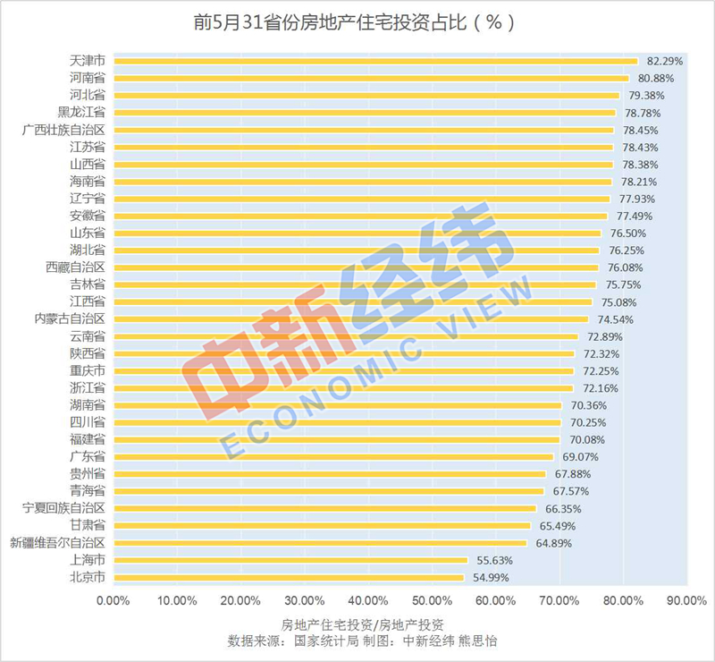 一組有意思的數據是,北京市房地產住宅投資占比(房地產住宅投資/房地產投資)最低為54.99%,距離北京不過100多公里的天津市卻是另一個極端,房地產住宅投資占比高達82.29%。上海市和江蘇省的情況同北京市和天津市有些相似,數據呈現兩極特點,房地產住宅投資占比分別為55.63%和78.43%。