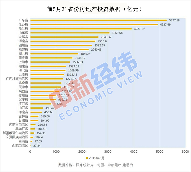 國家統計局數據顯示,前5月廣東省房地產投資累計值5277.18億元,領跑全國,江蘇省4927.49億元緊隨其后。浙江省雖以3921.19億元的投資額位列第三,但同廣東省、江蘇省差距明顯。