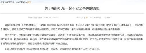 通報指出,7月22日下午15時50分,一架廈門航空公司B737-800型飛機(機號B-1550)執行福州至廈門航班(航班號MF8422),飛機按指令滑行時,機組發現前方有地面車輛穿越滑行道,機組立即采取措施,未與車輛發生碰撞,福州機場航班也未受到影響。