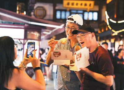 游客在上海豫園夜市開心地品嘗當地特色小吃生煎包。新華社記者 劉 穎攝