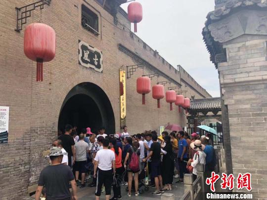 當日14時左右,室外溫度超過30度,喬家大院外的廣場上依然游人不斷,想進入景區,人們還需要排隊等待幾分鐘?!±钔ヒ?攝
