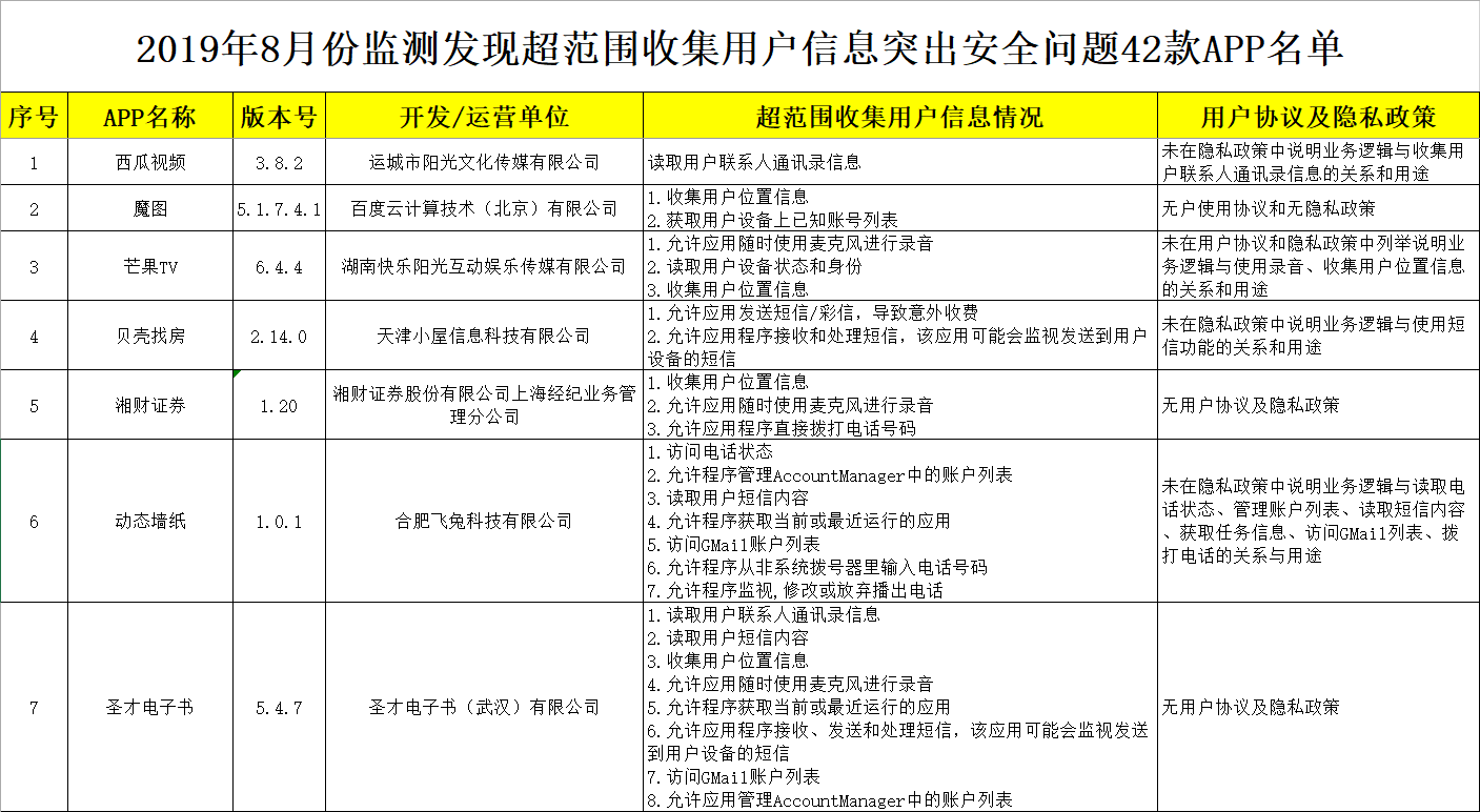 其中“西瓜視頻”“貝殼找房”“芒果TV”等42款A(yù)PP,存在超范圍讀取用戶通話記錄、短信或彩信,收集用戶通訊錄、用戶設(shè)備上已知賬號,超權(quán)限使用用戶設(shè)備麥克風(fēng)等突出安全問題。目前,廣東省公安機關(guān)已將有關(guān)監(jiān)測情況上報公安部通報屬地公安機關(guān)開展清理整治。擴散周知!(央視記者 陳旭婷 高天嬌)